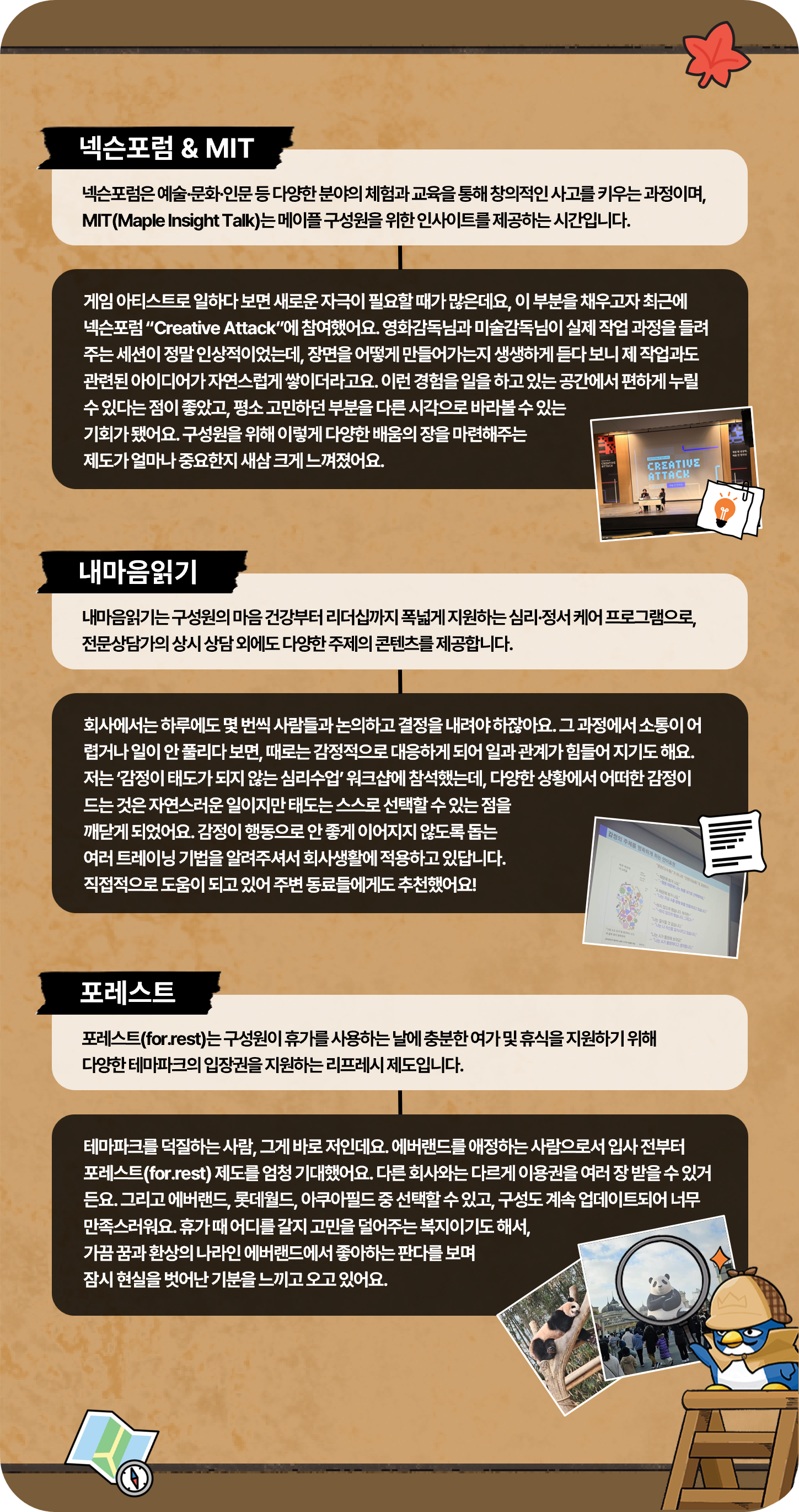 집중해서 업무에 몰입할 수 있는 시간, 새로운 자극을 주는 지식,그리고 마음의 부담감을 덜고 에너지를 충전하는 경험은결국 우리가 더 잘 일하고, 더 오래 성장하도록 만들어주는 힘이 됩니다.